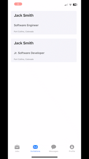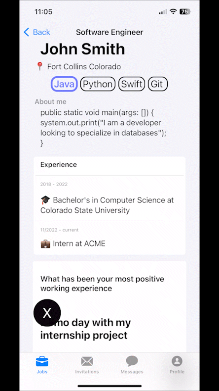 Our app features interactive profiles and job applications where a recruiter or job searcher can comment on what caught their eye. Our UI is designed to reduce the time it takes to reach out to a job searcher or recruiter which is why profiles and job applications in our app are shorter than typical resumes and online job applications. Invitations are a simple and quick way to manage pending connections and in-app chat allows the conversation to get started in a casual and on-demand manner.